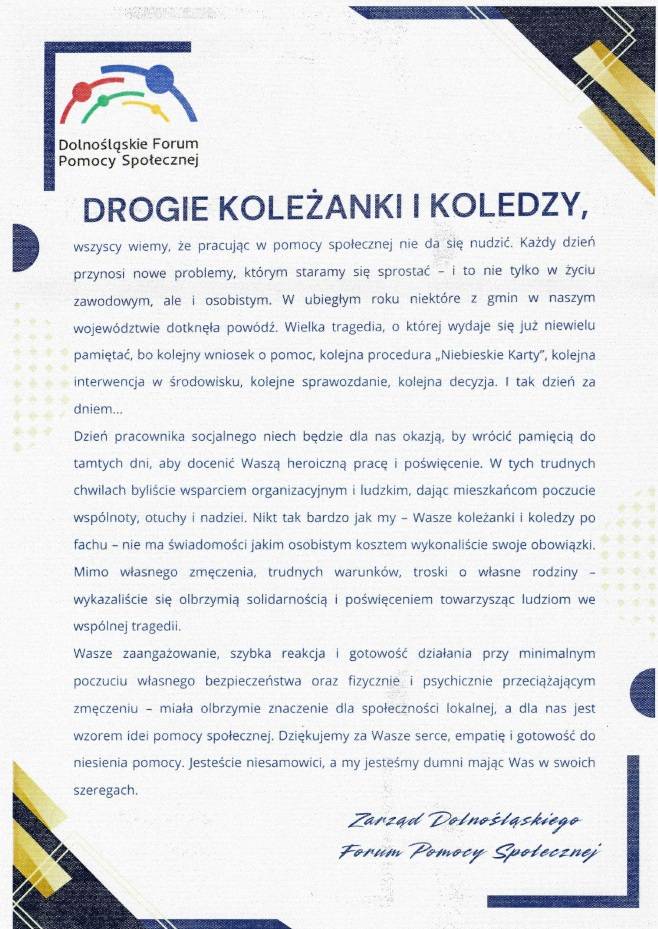 Przedstawiciele MOPS w Jeleniej Górze przyjmując listy gratulacyjne podkreślili, że słowa głębokiego uznania i podziękowania kierują do pracowników, których praca jest najlepszym przykładem misji pomocy społecznej i niesienia wsparcia tam, gdzie jest ono najbardziej potrzebne. Wyrazili dumę, że tworzą zespół, który potrafi sprostać nawet najtrudniejszym wyzwaniom.