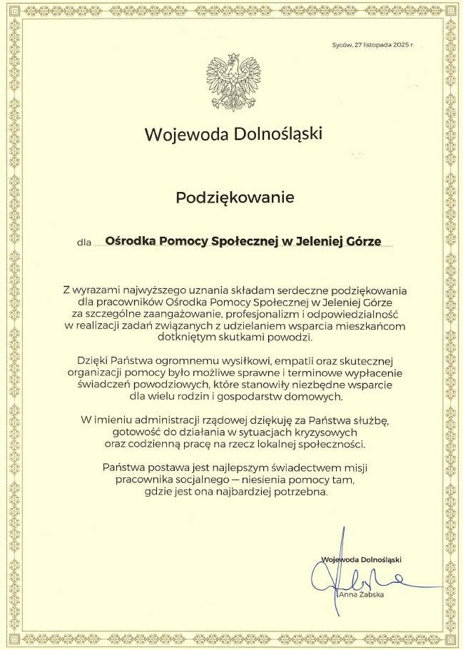 Wyjątkowe zaangażowanie, profesjonalizm i odpowiedzialność w realizacji działań związanych z udzielaniem pomocy mieszkańcom, w szczególności poszkodowanym w wyniku powodzi – to powody kolejnego ważnego wyróżnienia, które otrzymał Miejski Ośrodek Pomocy Społecznej w Jeleniej Górze.