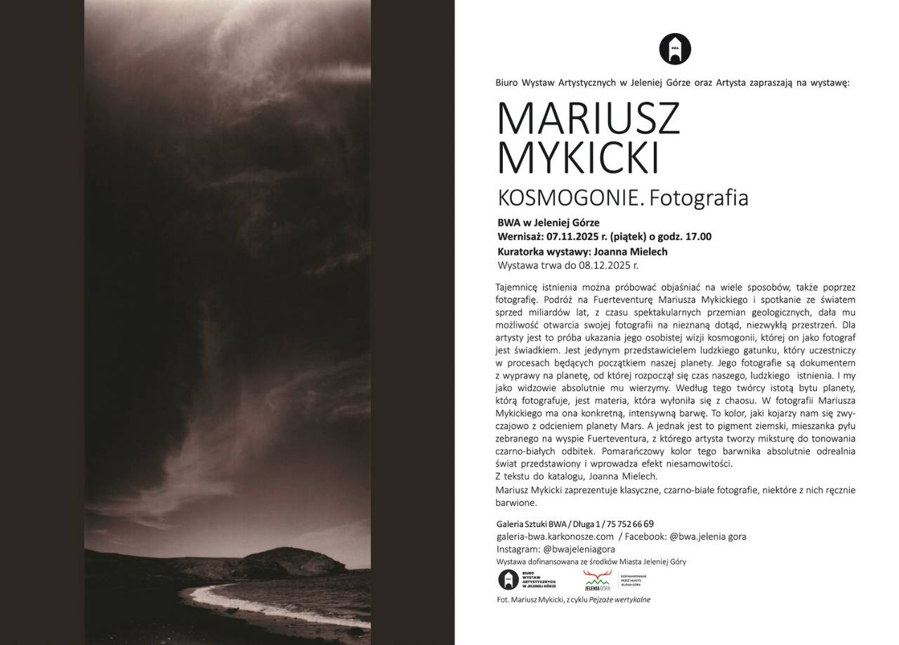 Pejzaże tych fotografii sprawiają wrażenie obrazów z nieznanej nam planety. Rozległe i puste przestrzenie wydają się pochodzić z innego wymiaru wszechświata albo z czasu, gdy kształtowała się nasza Galaktyka. Monika Cichoszewska i Mariusz Mykicki opowiadają nam o swoich wyobrażeniach dotyczących genezy wszechświata. Tym, co charakteryzuje ich fotografie krajobrazu, jest przejmujące doznanie pustki otaczającej pozbawioną śladów życia materię, które nie przypomina niczego ze znanych nam ziemskich wizualnych wrażeń. Fotografia jest także analizą pierwotnych struktur powierzchni planety, która na ich fotografiach wygląda, jakby dopiero co zakończyły się metamorficzne procesy przemiany z bezkształtnego chaosu w materię (z tekstu do katalogu Joanna Mielech).