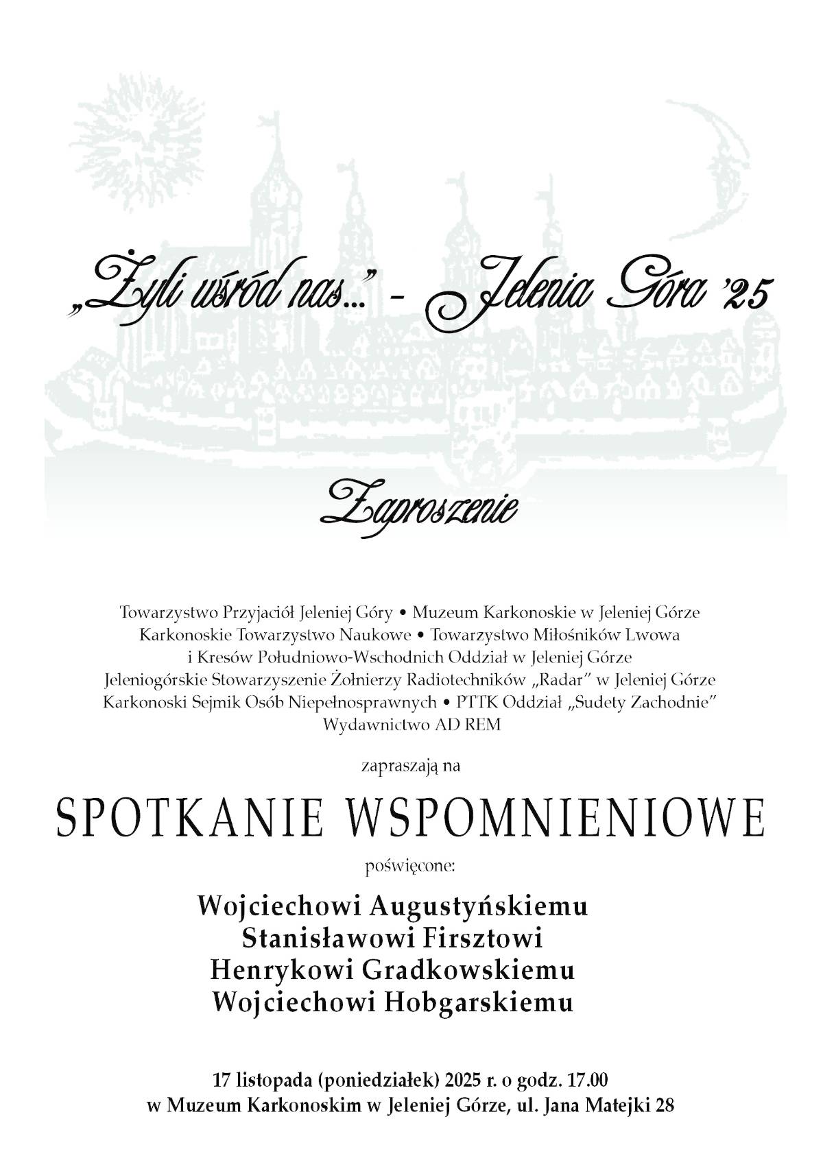 Serdecznie zapraszamy 17 listopada o godz. 17:00 na wieczór wspomnień o osobach zasłużonych dla naszego miasta i regionu, którzy odeszli w 2025 roku.