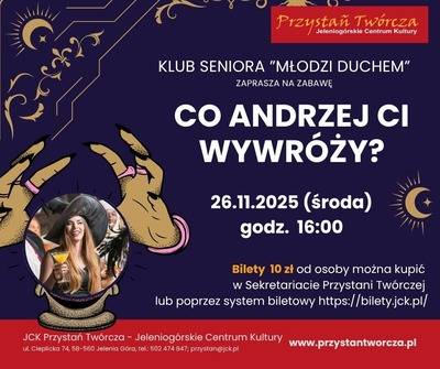 Zapraszamy na wyjątkową andrzejkową zabawę pod hasłem "Co Andrzej Ci wywróży?&"która przeniesie uczestników w świat tajemniczych wróżb, magii i radosnej muzyki. Nie zabraknie również naszego ulubionego DJ POWERA, który porwie nas na parkiet. Czekają na Państwa miła atmosfera, drobny poczęstunek i ciekawe wróżby.