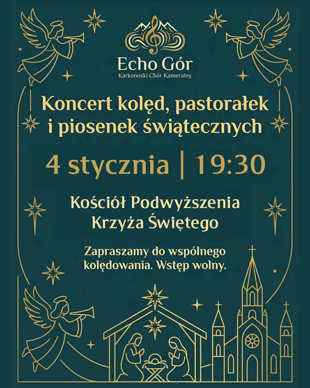 Zapraszamy na wyjątkowy, nastrojowy wieczór pełen dźwięków, które przedłużają magię Bożego Narodzenia. W pięknej przestrzeni świątyni zabrzmią tradycyjne kolędy, pastorałki oraz znane i lubiane piosenki świąteczne w wykonaniu Karkonoskiego Chóru Kameralnego Echo Gór.
