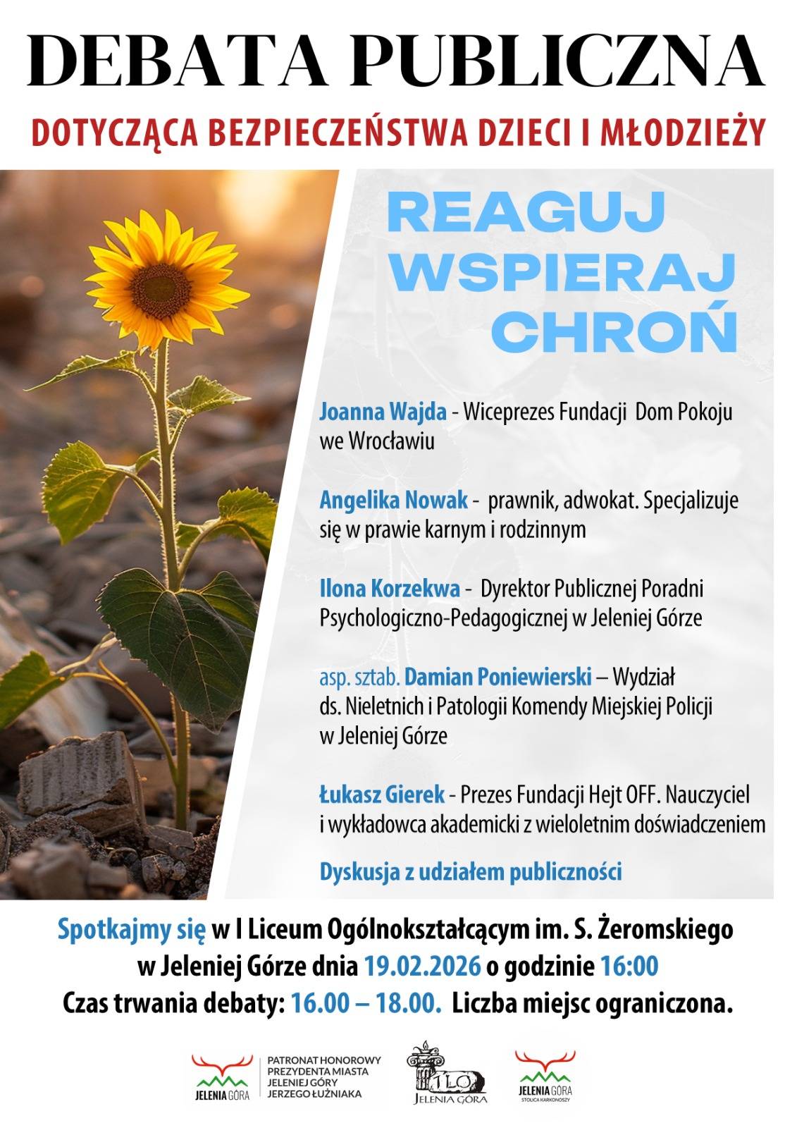 19 lutego br., godz. 16.00 w I LO im. Stefana Żeromskiego w Jeleniej Górze odbędzie się otwarta debata poświęcona bezpieczeństwu dzieci i młodzieży, edukacji psychologicznej oraz kształtowania postaw i wartości.