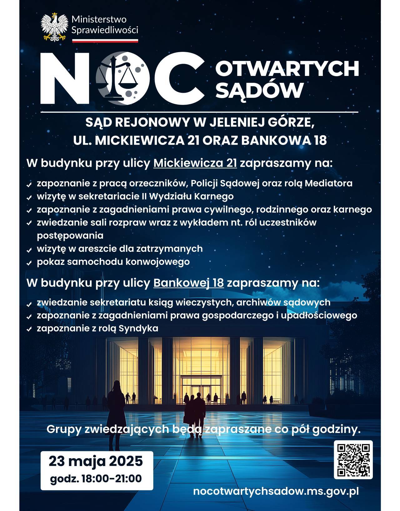 Na wydarzenie obowiązują zapisy e-mailowe pod adresem: dep@jelenia-gora.sr.gov.plW zgłoszeniu należy wskazać imię i nazwisko uczestnika wydarzenia, budynek Sądu (ul. Mickiewicza 21 lub ul. Bankowa 18) i preferowaną godzinę uczestnictwa. Grupy zwiedzających będą zapraszane co pół godziny. Ostanie wejście 20:30.Zgłoszenia przyjmowane będą do 21.05.2025 roku (środa).Warunkiem uczestnictwa jest otrzymanie e-mailowego potwierdzenia zapisu.
