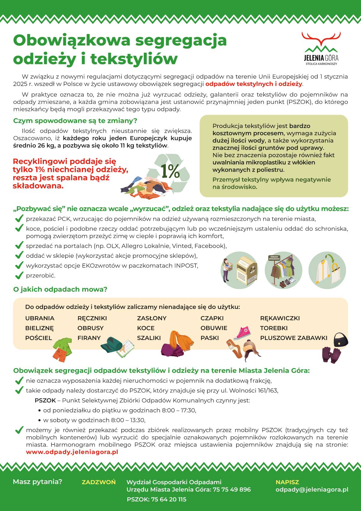 Odzież i tekstylia nienadające się do dalszego użytku należy przekazywać do Punktu Selektywnej Zbiórki Odpadów Komunalnych (PSZOK) przy ul. Wolności 161/163 w Jeleniej Górze. Punkt czynny jest od poniedziałku do piątku w godz. 8:00–17:30 oraz w soboty w godz. 8:00–13:30.