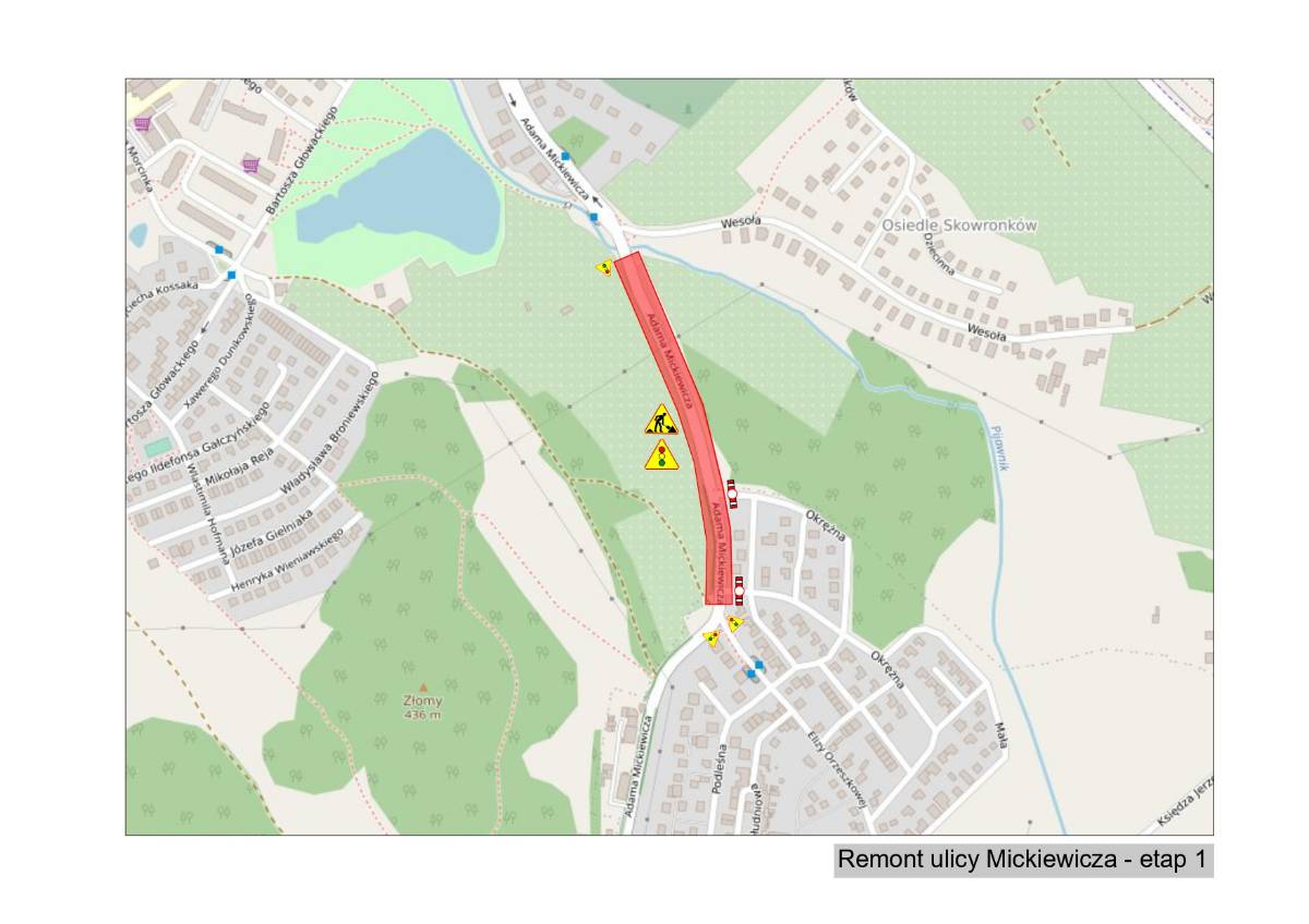 Uwaga kierowcy – od środy, 10 września rozpoczną się prace związane z remontem ulicy Mickiewicza w Jeleniej Górze – na odcinku powyżej skrzyżowania z ulicą Wesołą, za mostem nad potokiem Pijawnik, do granicy miasta.
