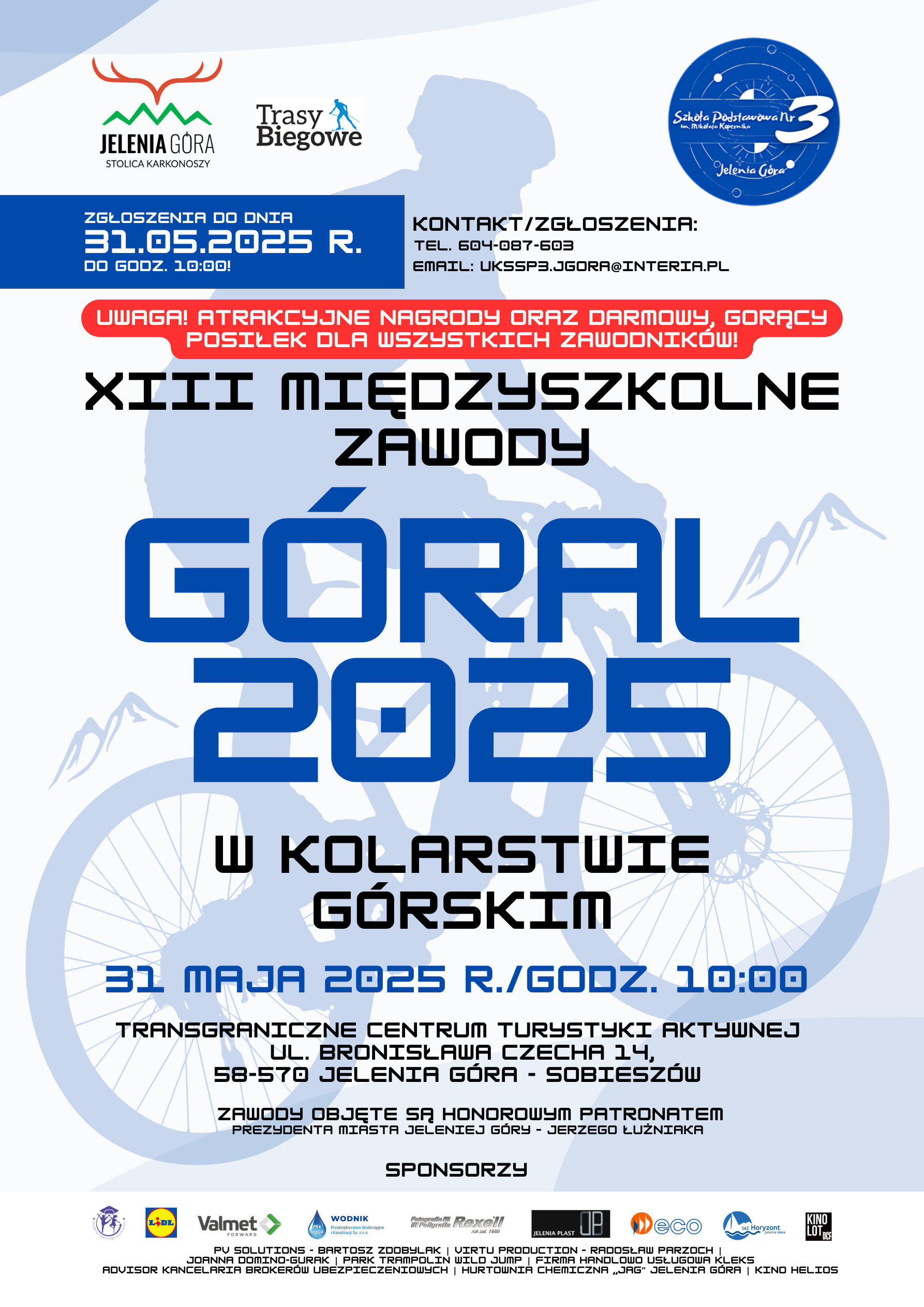 Zapraszamy dzieci i dorosłych na XIII edycję zawodów rowerowych - „Góral 2025” organizowanych przez Szkołę Podstawową nr 3 w Jeleniej Górze i UKS „Kopernikus”. ...