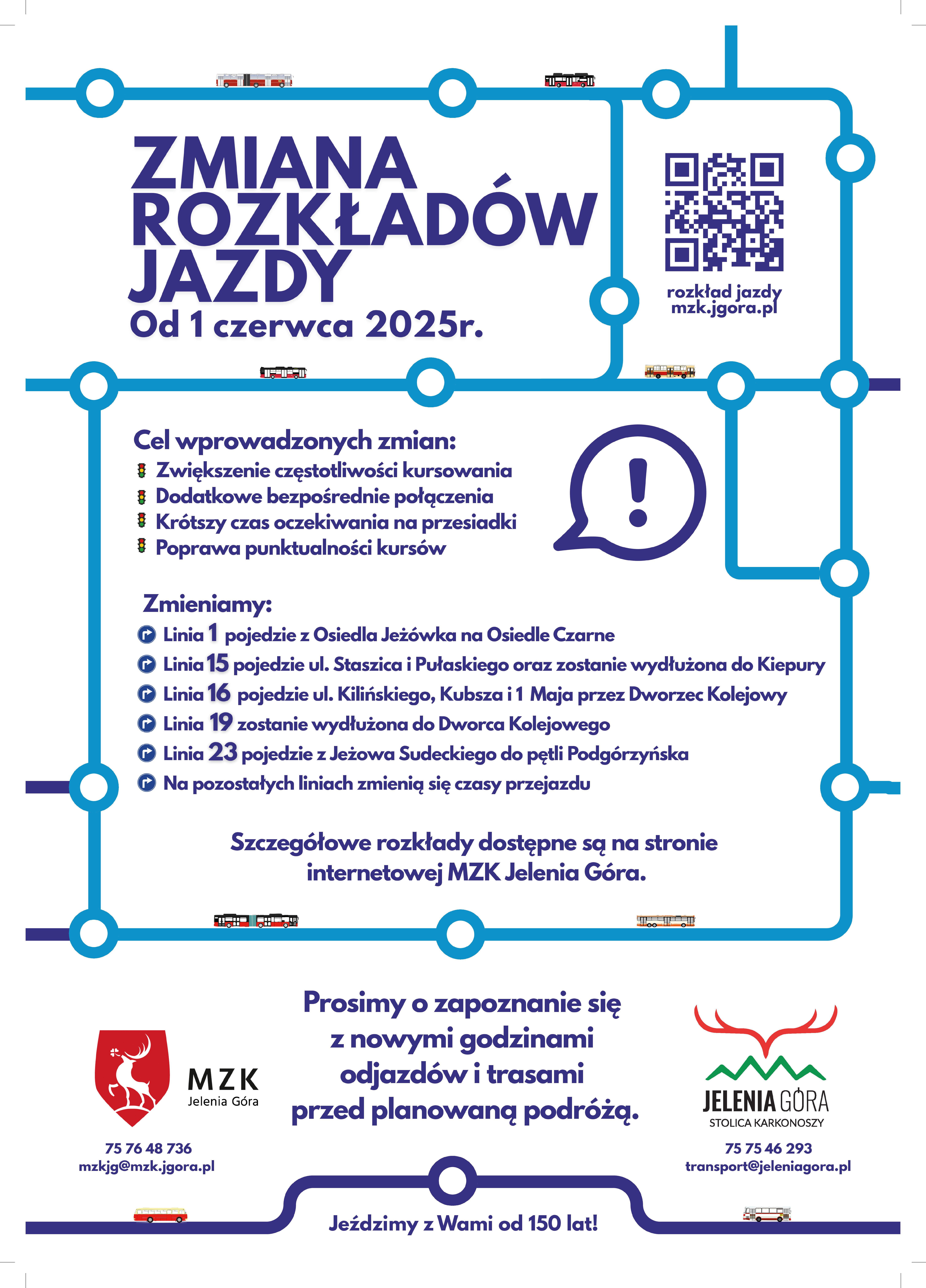 Od 1 czerwca 2025 roku w życie wejdzie nowy rozkład jazdy autobusów MZK Jelenia Góra. Nowy układ linii i zmienione godziny kursów mają lepiej odpowiadać na potrzeby pasażerów – to efekt analiz i konsultacji prowadzonych przez miejskiego przewoźnika....