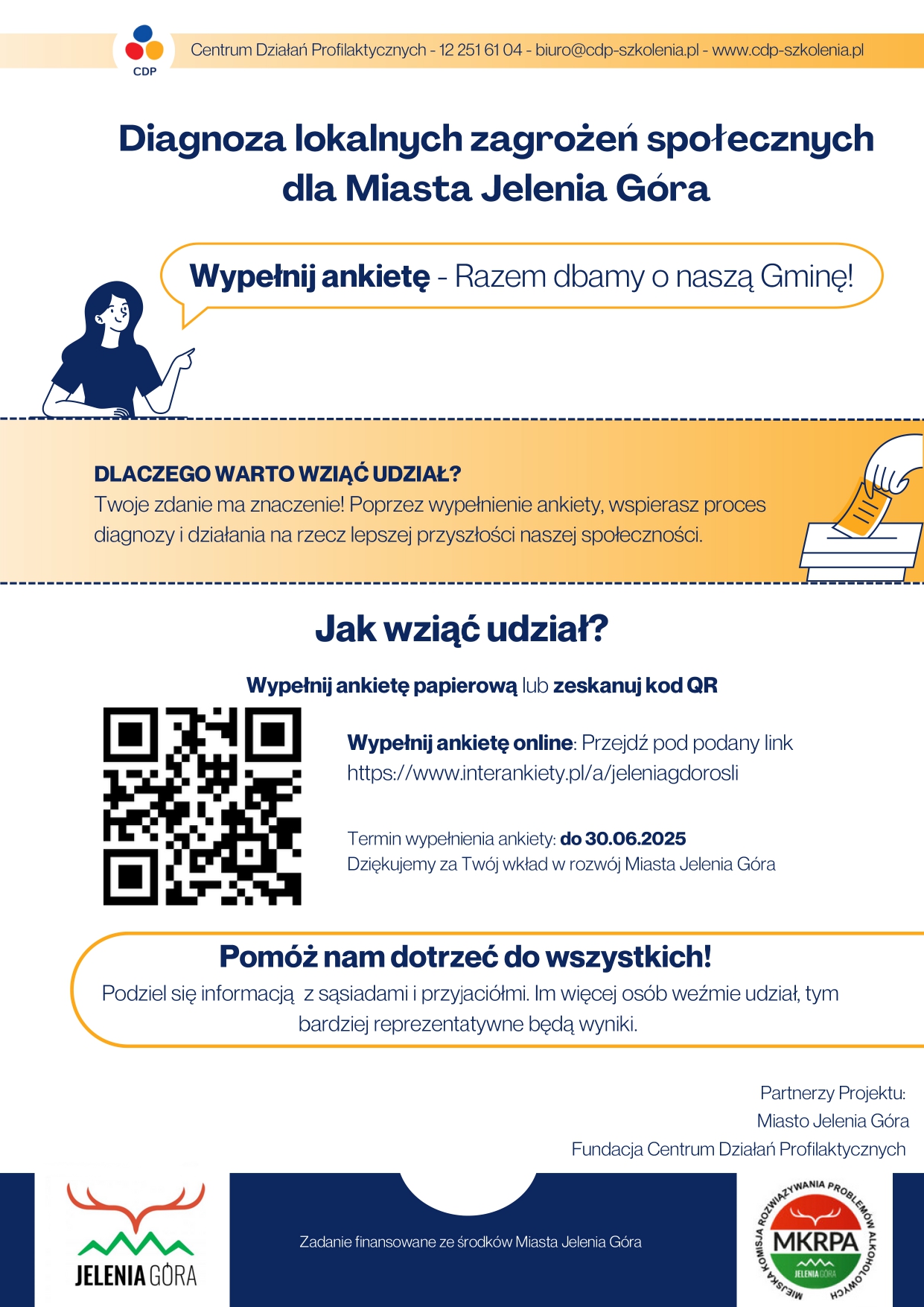 Fundacja Centrum Działań Profilaktycznych działając na zlecenie Miasta Jelenia Góra przygotowało dla Państwa ankietę, dotyczącą zagrożeń społecznych na terenie Miasta Jelenia Góra Wyniki badania zostaną wykorzystane do opracowania „Diagnozy Lokalnych Zagrożeń Społecznych...