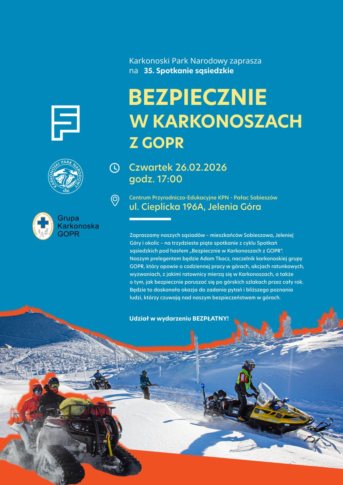 Zapraszamy naszych sąsiadów – mieszkańców Sobieszowa, Jeleniej Góry i okolic – na trzydzieste piąte spotkanie z cyklu Spotkań sąsiedzkich pod hasłem „Bezpiecznie w Karkonoszach z GOPR”.
