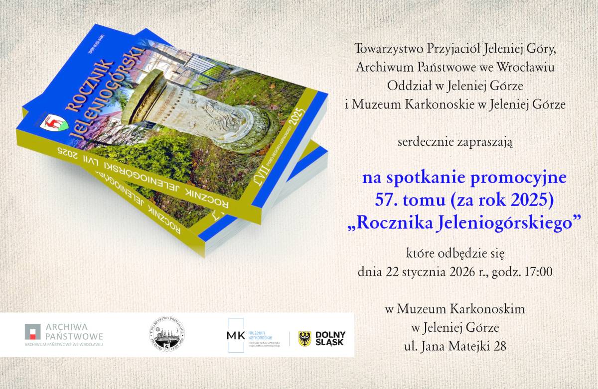 Muzeum Karkonoskie w Jeleniej Górze, Archiwum Państwowe we Wrocławiu Oddział w Jeleniej Górze oraz Towarzystwo Przyjaciół Jeleniej Góry serdecznie zapraszają 22 stycznia 2026 (czwartek) o godzinie 17:00 na spotkanie promocyjne 57. tomu (za rok 2025) "Rocznika Jeleniogórskiego".