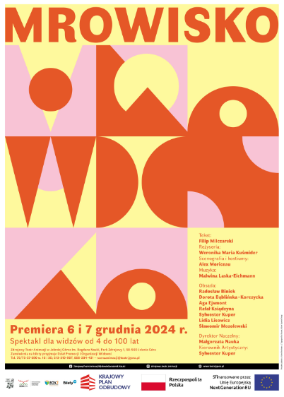 Pewnego dnia w mrowisku zaczynają pojawiać się śmieciowe kule, które zakłócają dotychczasowe życie i pracę mrówek. Mrówka Marcysia, której kule coraz bardziej przesłaniają widok na świat, postanawia znaleźć sposób na pozbycie się ich i uratowanie mrowiska przed śmieciami. W trakcie wyprawy tata Marcysi – Mirosław – zostaje porwany przez tajemniczego Żuka. Marcysia i nieoczekiwani sprzymierzeńcy ruszają na pomoc. Czy uda jej się uratować tatę? Jaką tajemnicę skrywa Żuk? I co stanie się ze śmieciowymi kulami? Mrowisko to metafora naszych czasów, w której przejrzeć mogą się zarówno dzieci, jak i ich rodzice, opiekunowie oraz dziadkowie. Sceniczna opowieść pomoże zapoczątkować międzypokoleniowe rozmowy na aktualne tematy: ekologii, kryzysu klimatycznego, odpowiedzialności czy odwagi cywilnej.