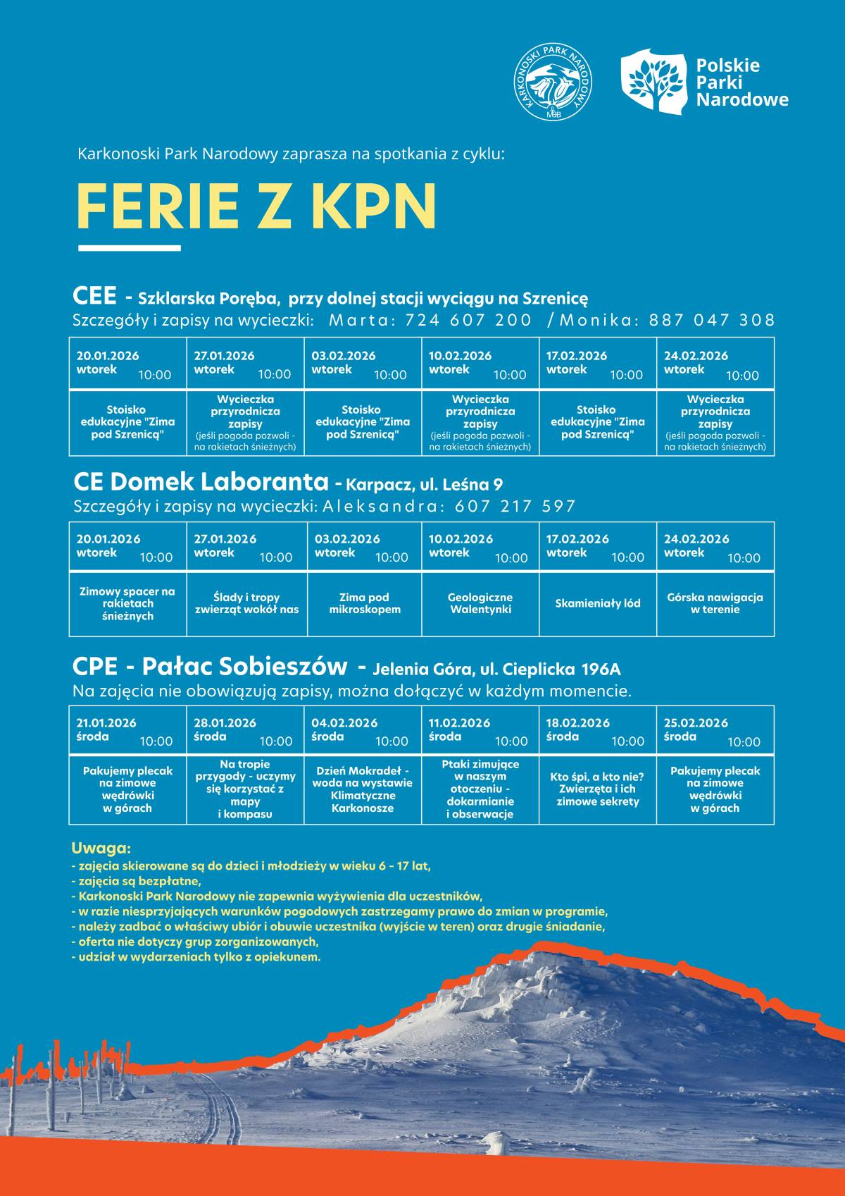Karkonoski Park Narodowy nie zapewnia wyżywienia dla dzieci, w razie niesprzyjających warunków pogodowych zastrzegamy prawo do zmian w programie, należy zadbać o właściwy ubiór i obuwie uczestnika (wyjście w teren) oraz drugie śniadanie, oferta nie dotyczy grup zorganizowanych.