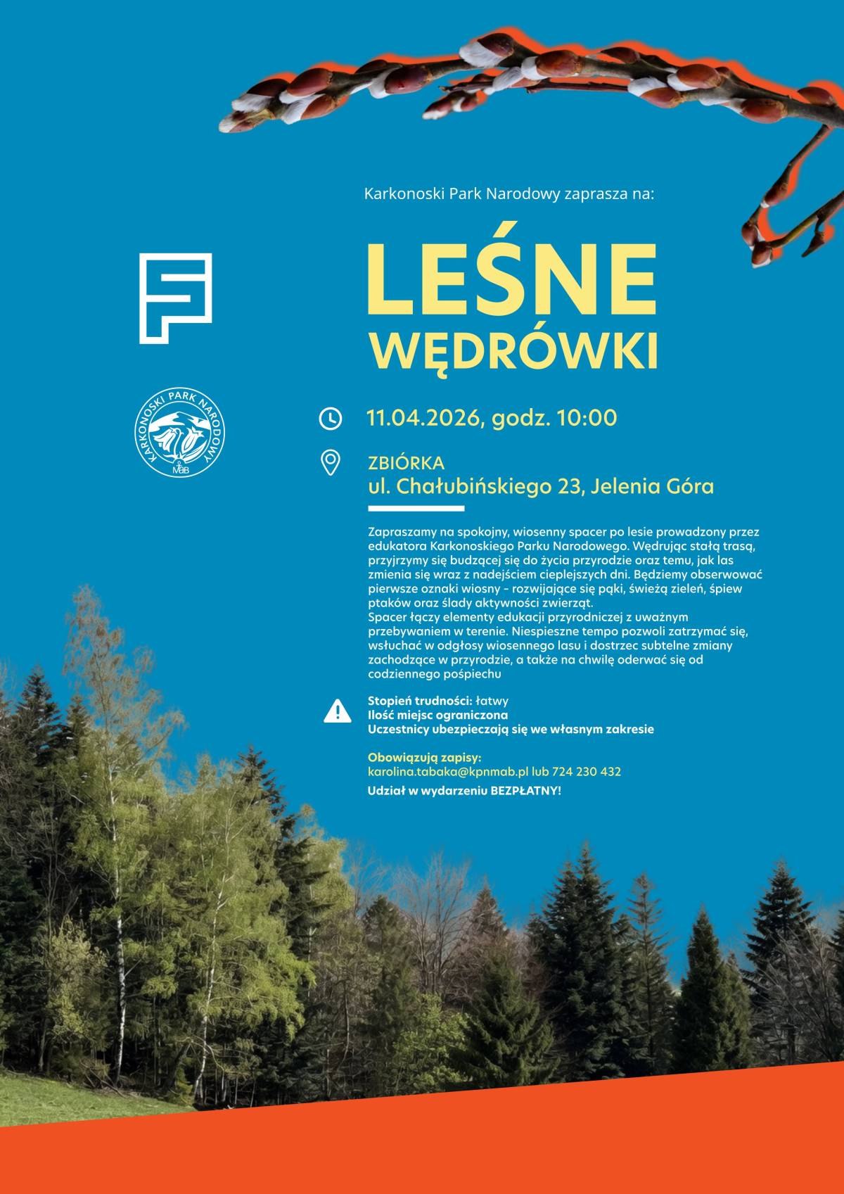 Zapraszamy na spokojny, wiosenny spacer po lesie prowadzony przez edukatora Karkonoskiego Parku Narodowego. Wędrując stałą trasą, przyjrzymy się budzącej się do życia przyrodzie oraz temu, jak las zmienia się wraz z nadejściem cieplejszych dni. Będziemy obserwować pierwsze oznaki wiosny – rozwijające się pąki, świeżą zieleń, śpiew ptaków oraz ślady aktywności zwierząt.