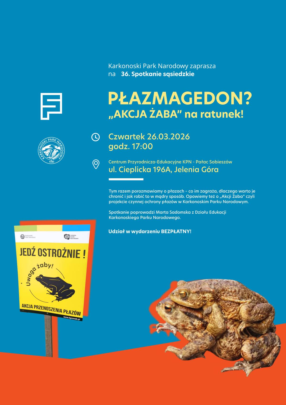 Zapraszamy naszych sąsiadów – mieszkańców Sobieszowa, Jeleniej Góry i okolic – na trzydzieste szóste spotkanie z cyklu Spotkań sąsiedzkich pod hasłem Płazmagedon? „Akcja Żaba” na ratunek!